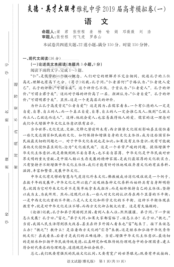 【語文】炎德英才大聯(lián)考2019雅禮中學(xué)高三9次月考(模擬一)