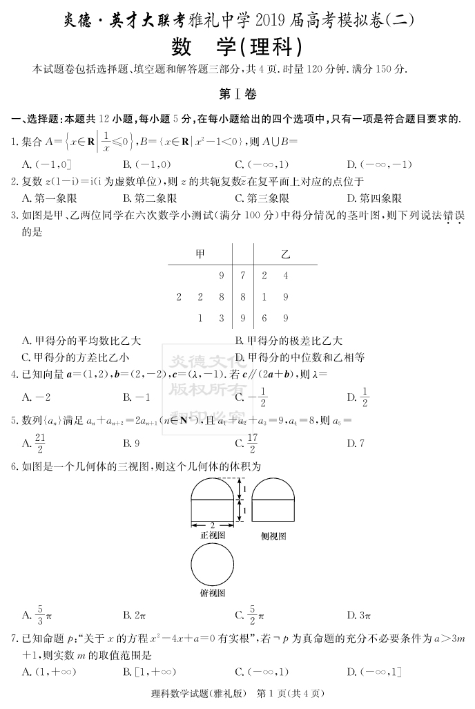 【理數(shù)】炎德英才大聯(lián)考2019雅禮中學(xué)高三10次月考(模擬二)