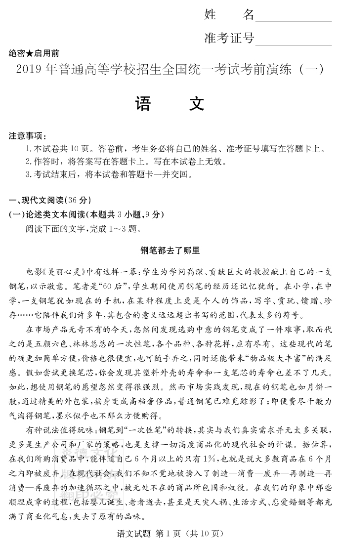 【語(yǔ)文】2019年普通高等學(xué)校招生全國(guó)統(tǒng)一考試考前演練(一)