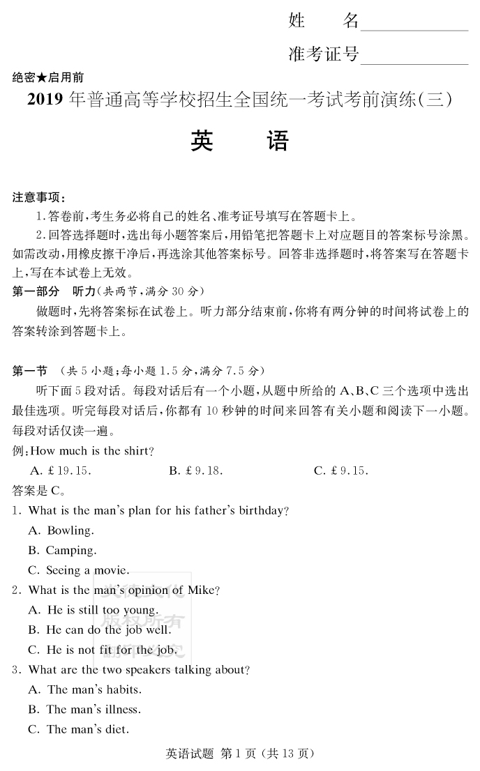 【英語】2019年普通高等學(xué)校招生全國統(tǒng)一考試考前演練(三)