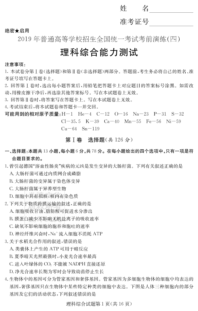 【理綜】2019年普通高等學校招生全國統(tǒng)一考試考前演練(四)