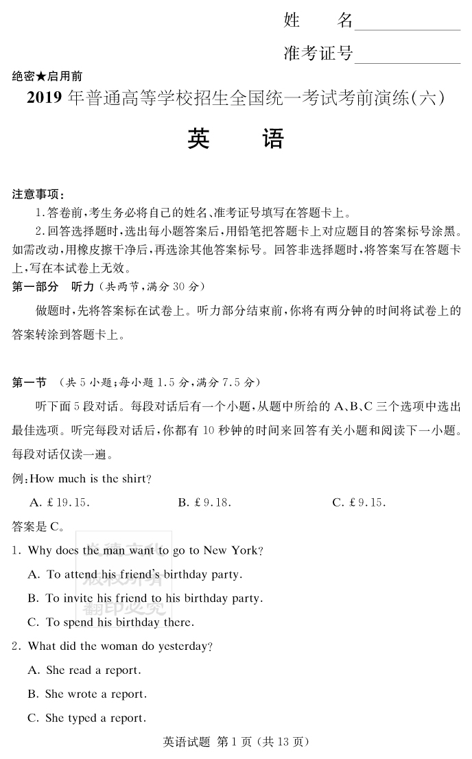 【英語】2019年普通高等學(xué)校招生全國統(tǒng)一考試考前演練(六)