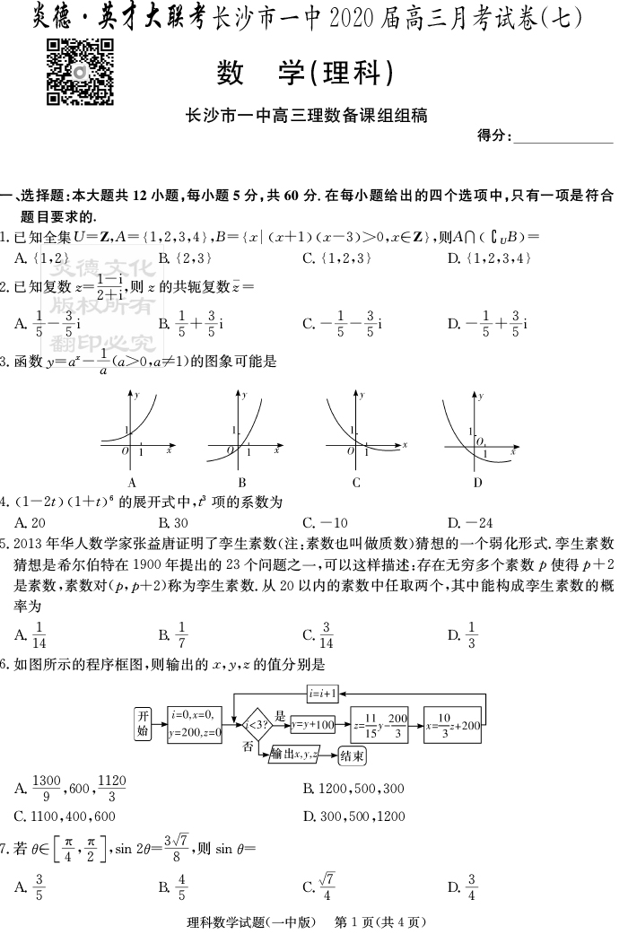 【理數(shù)】炎德英才大聯(lián)考2020屆長(zhǎng)沙市一中高三7次月考