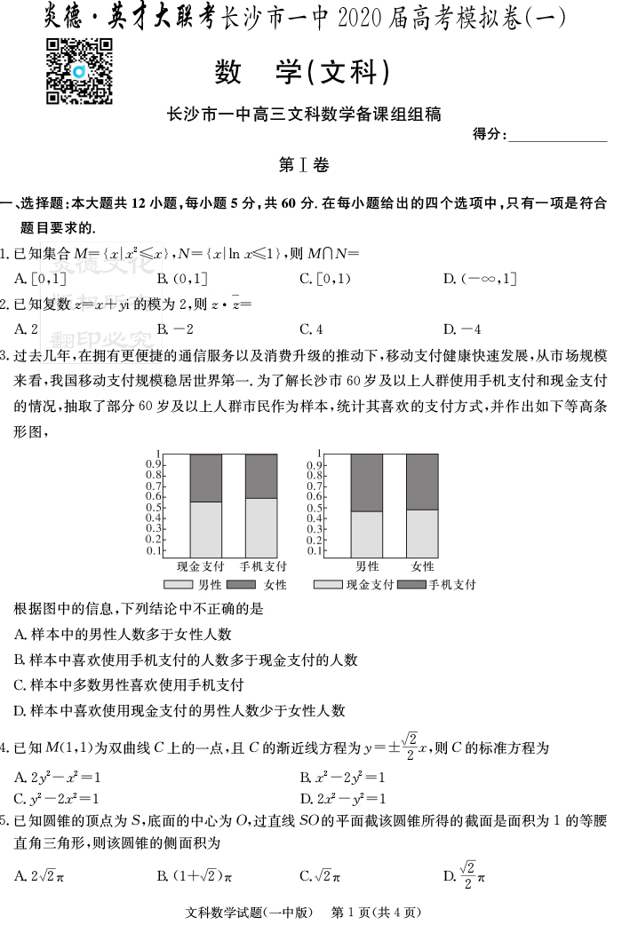 【文數(shù)】炎德英才大聯(lián)考2020屆長(zhǎng)沙市一中高三9次月考(模擬一)