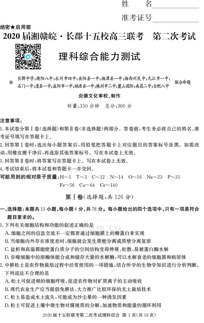 【理綜】炎德英才大聯(lián)考2020屆長郡中學(xué)高三8次月考(十五校聯(lián)考一)