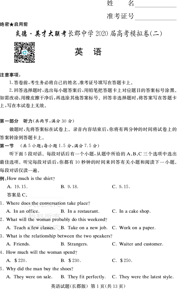 【英語(yǔ)】炎德英才大聯(lián)考2020屆長(zhǎng)郡中學(xué)高三10次月考(模擬二)
