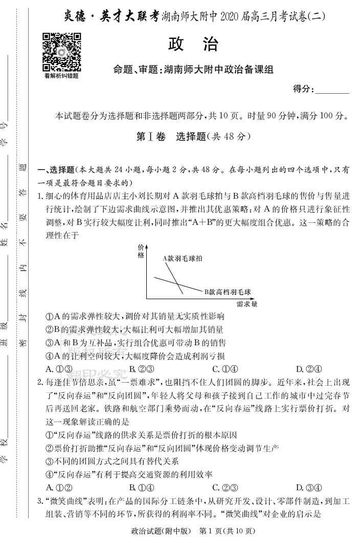 【政治】炎德英才大聯(lián)考2020屆師大附中高三2次月考