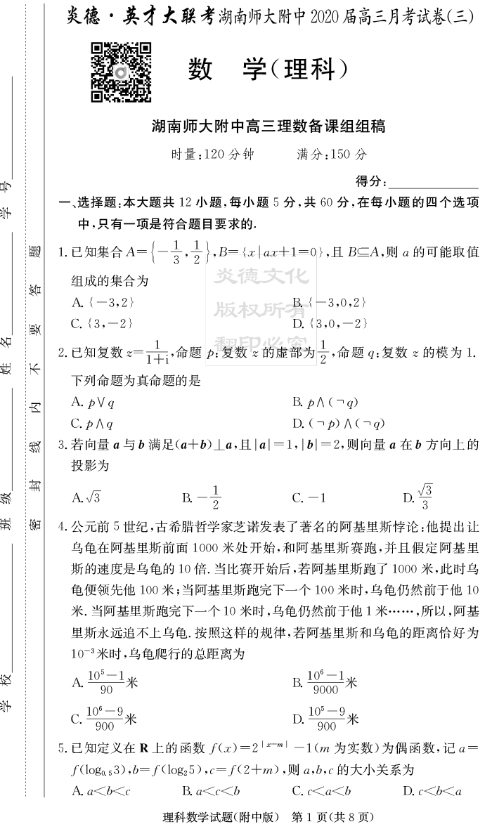 【理數(shù)】炎德英才大聯(lián)考2020屆師大附中高三3次月考
