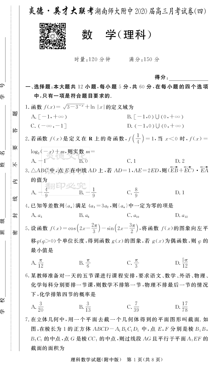 【理數(shù)】炎德英才大聯(lián)考2020屆師大附中高三4次月考