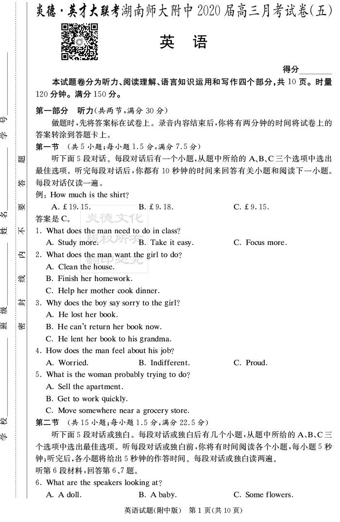 【英語(yǔ)】炎德英才大聯(lián)考2020屆師大附中高三5次月考