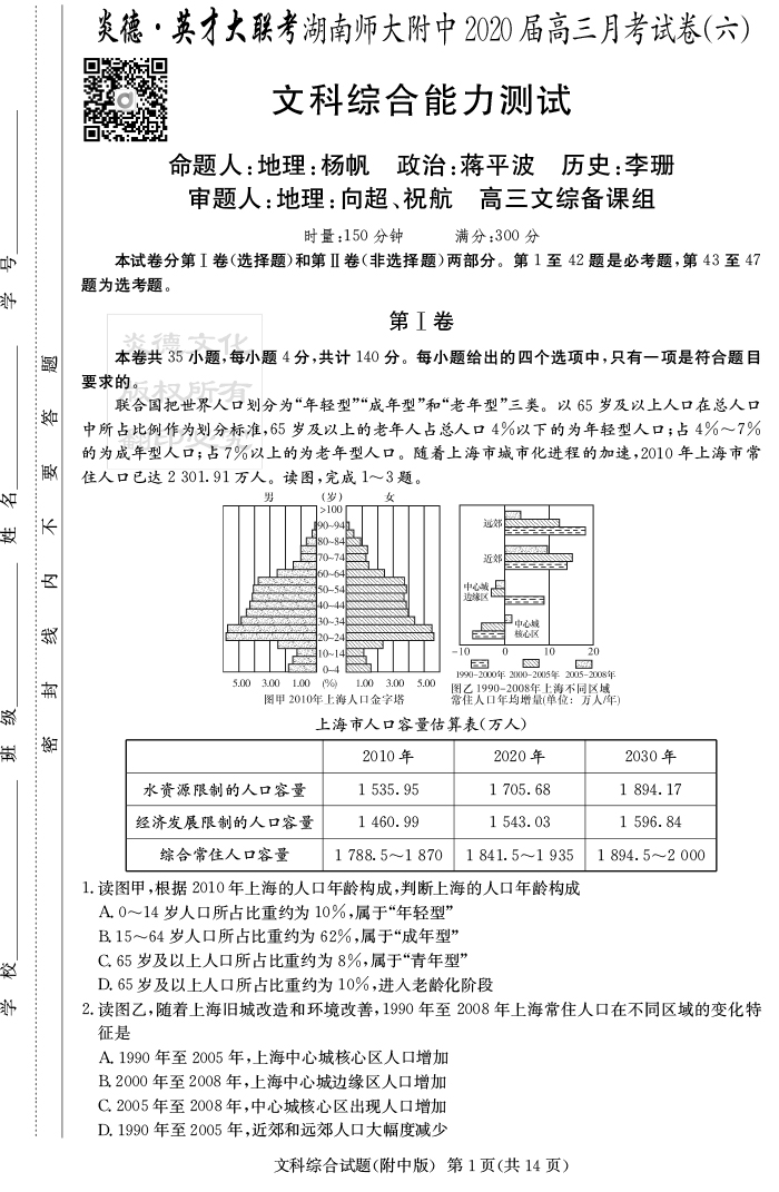 【文綜】炎德英才大聯(lián)考2020屆師大附中高三6次月考