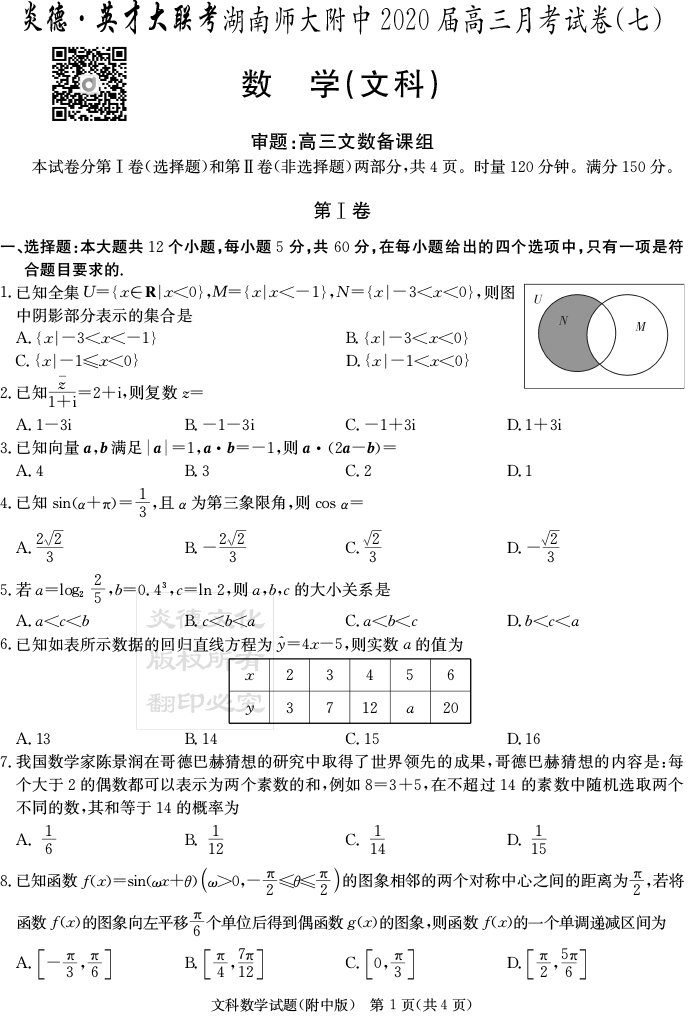 【文數(shù)】炎德英才大聯(lián)考2020屆師大附中高三7次月考
