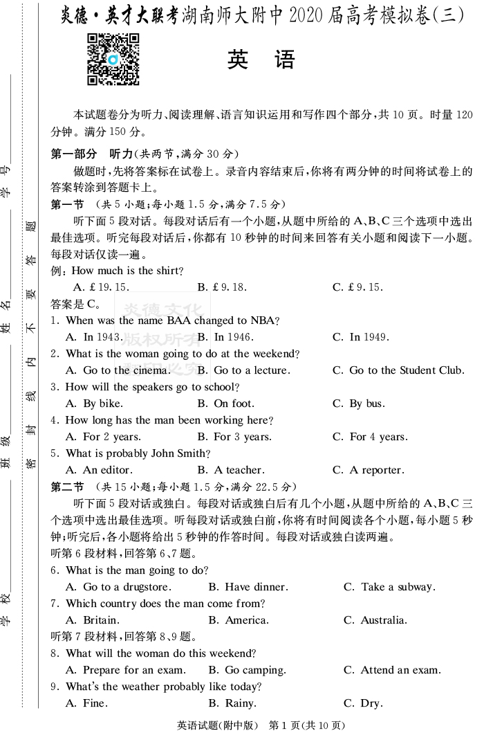 【英語(yǔ)】炎德英才大聯(lián)考2020屆師大附中高三10次月考(模擬三)