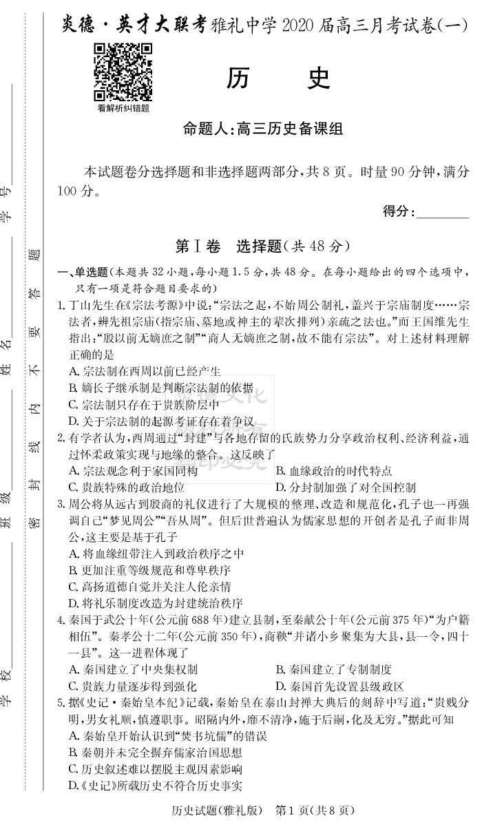 【歷史】炎德英才大聯(lián)考2020屆雅禮中學(xué)高三1次月考