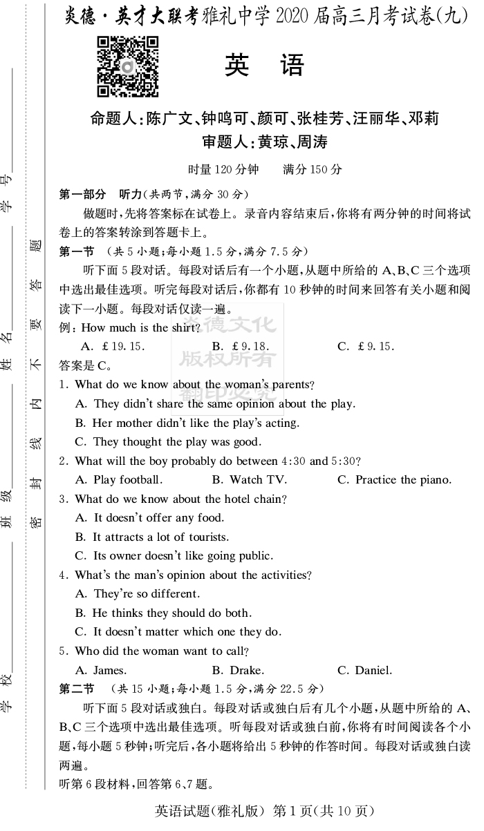 【英語】炎德英才大聯(lián)考2020屆雅禮中學(xué)高三9次月考