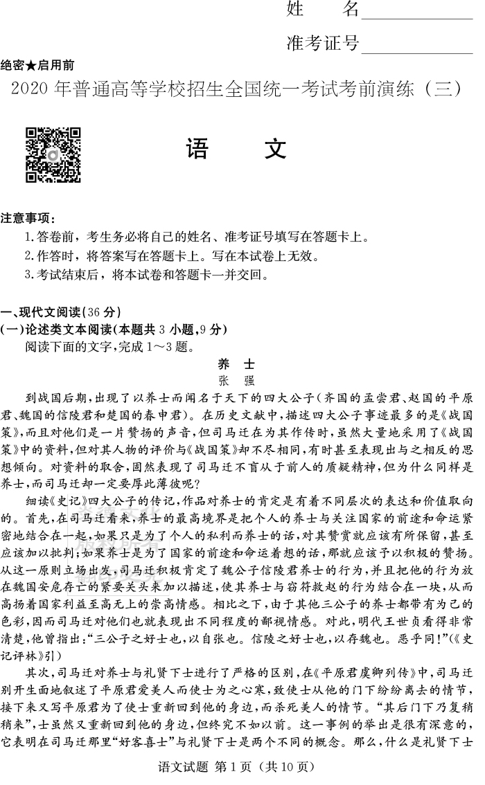 上一篇:【英語】2020年普通高等學校招生全國統(tǒng)一考試考前演練(三)