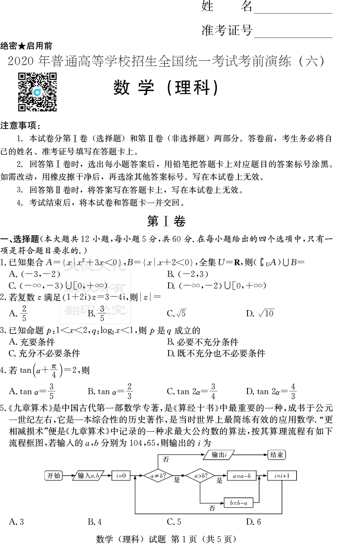 【理數(shù)】2020年普通高等學(xué)校招生全國(guó)統(tǒng)一考試考前演練(六)