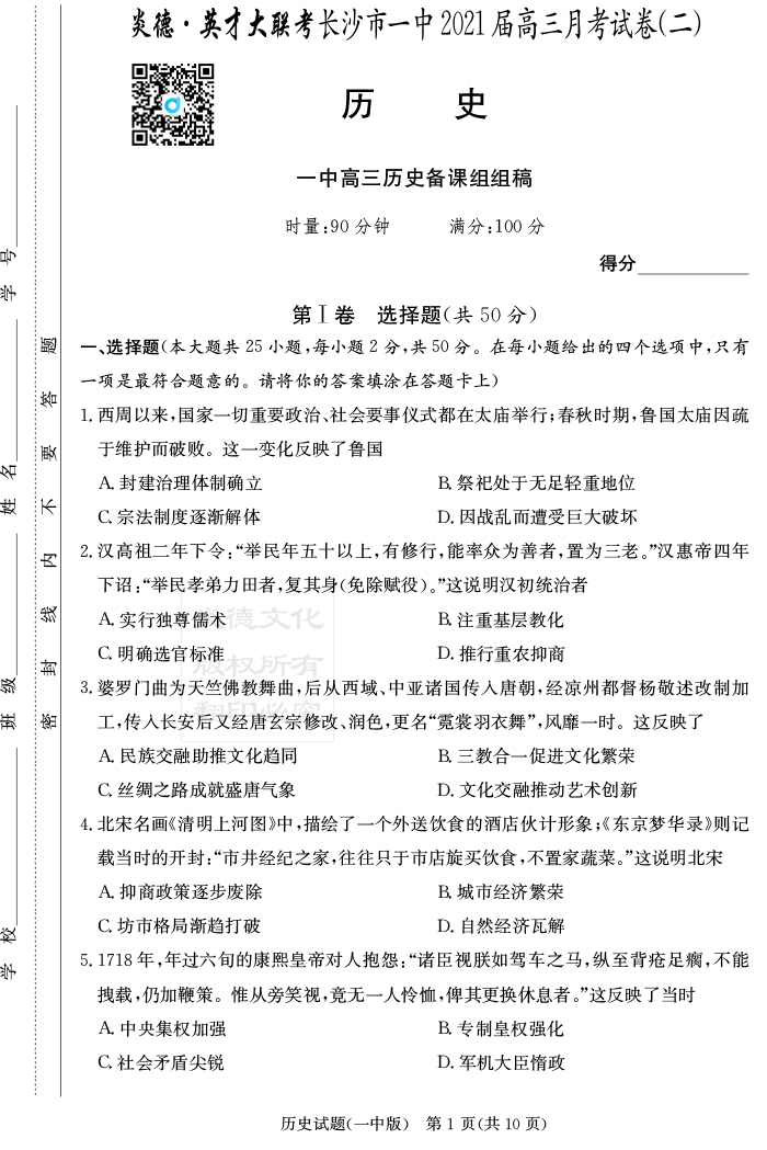 【歷史】炎德英才大聯(lián)考2021屆長沙市一中高三2次月考