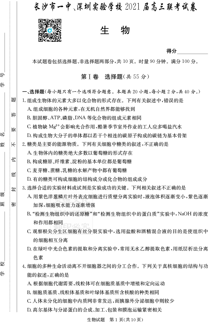 【生物】炎德英才大聯(lián)考2021屆長(zhǎng)沙市一中高三4次月考