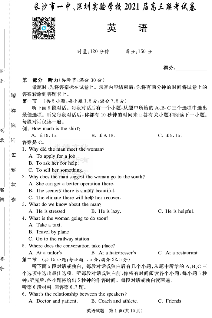 【英語】炎德英才大聯(lián)考2021屆長沙市一中高三4次月考