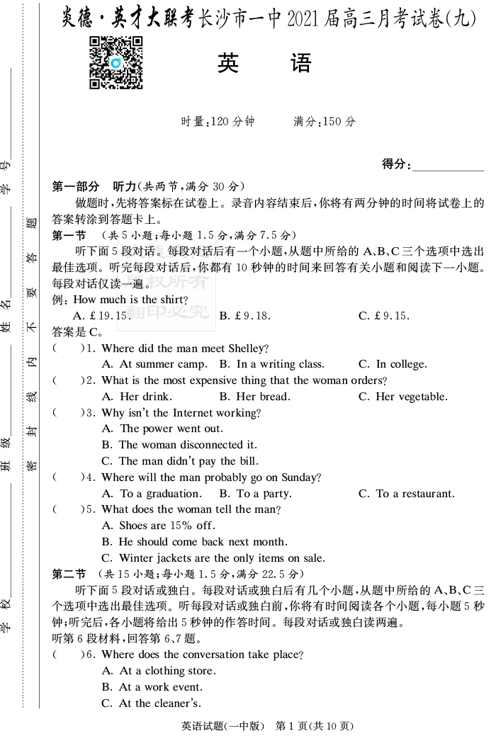【英語】炎德英才大聯(lián)考2021屆長沙市一中高三9次月考