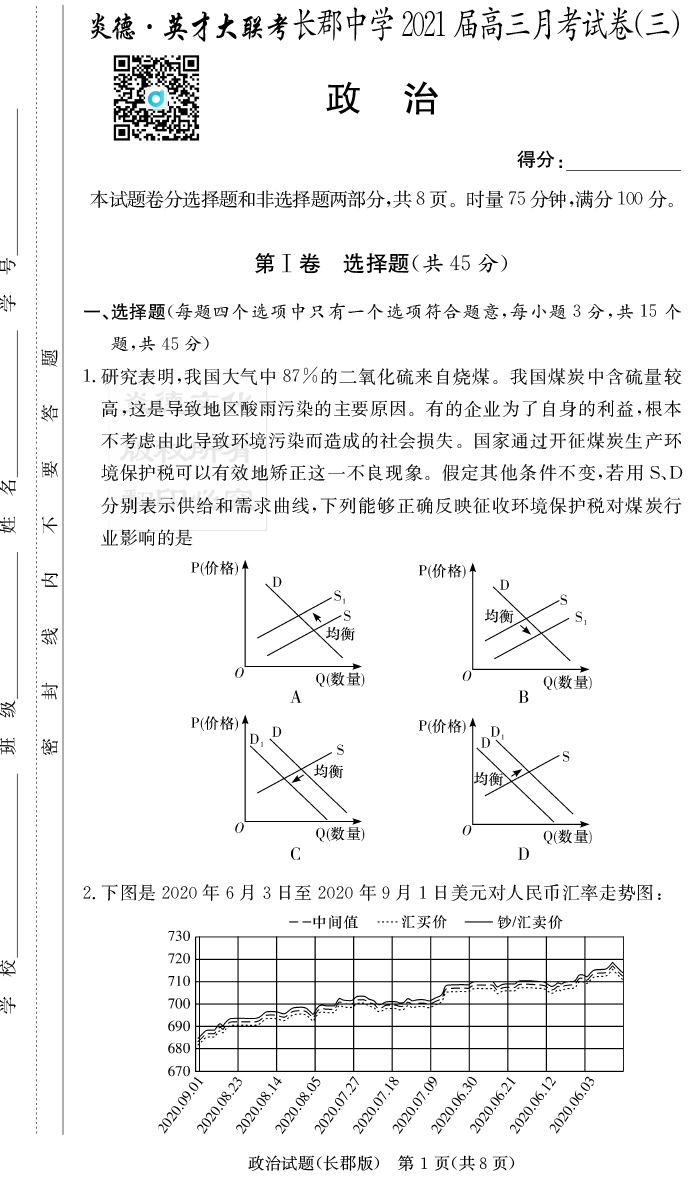 【政治】炎德英才大聯(lián)考2021屆長郡中學(xué)高三3次月考