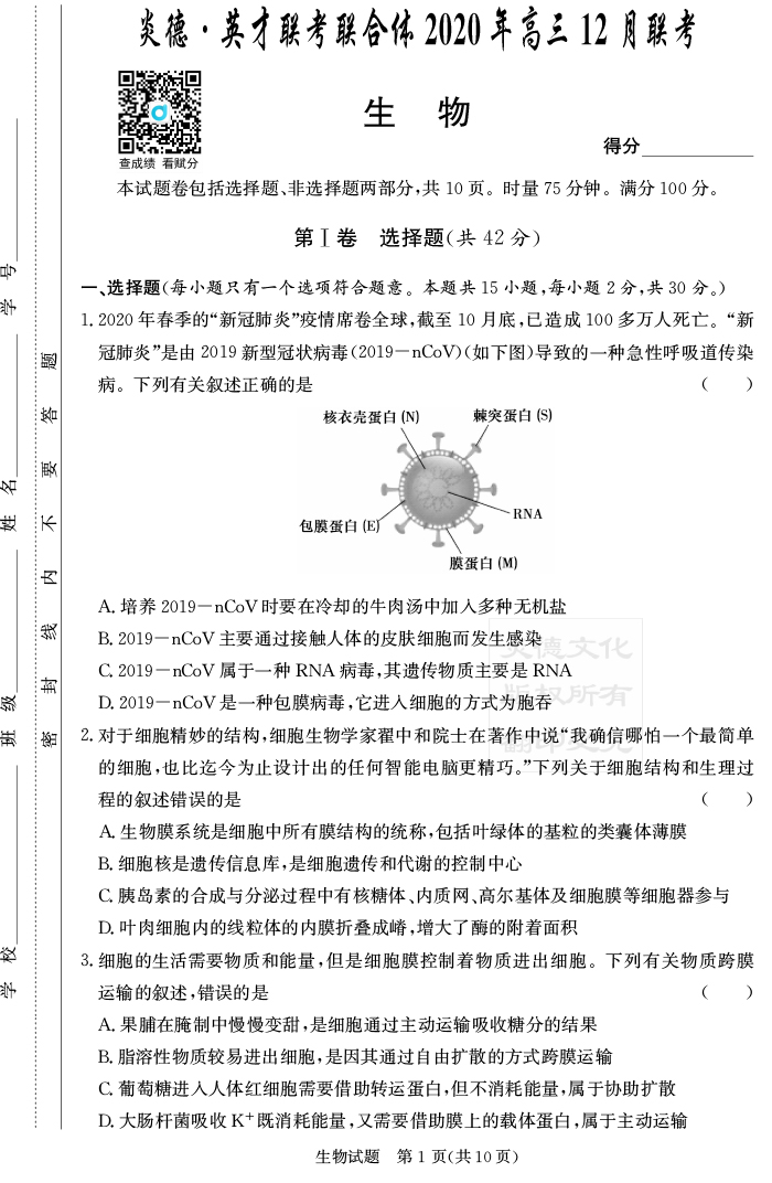 【生物】炎德英才大聯(lián)考2021屆長郡中學高三4次月考(高三聯(lián)合體12月聯(lián)考)