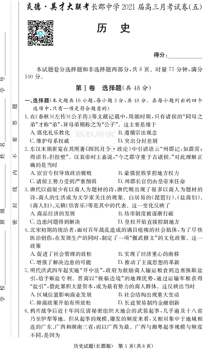 【歷史】炎德英才大聯(lián)考2021屆長郡中學(xué)高三5次月考