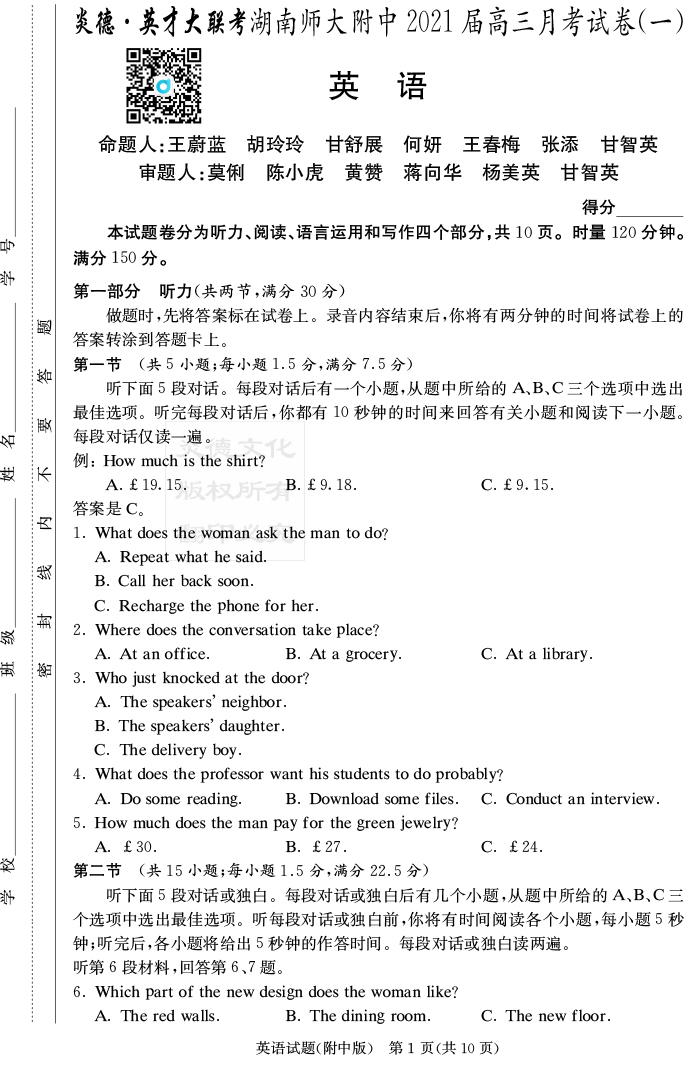 【英語】炎德英才大聯(lián)考2021屆湖南師大附中高三1次月考