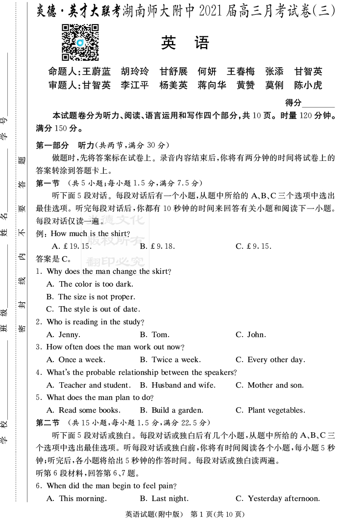 2026湖南師大附中新高考考前小題訓練·英語