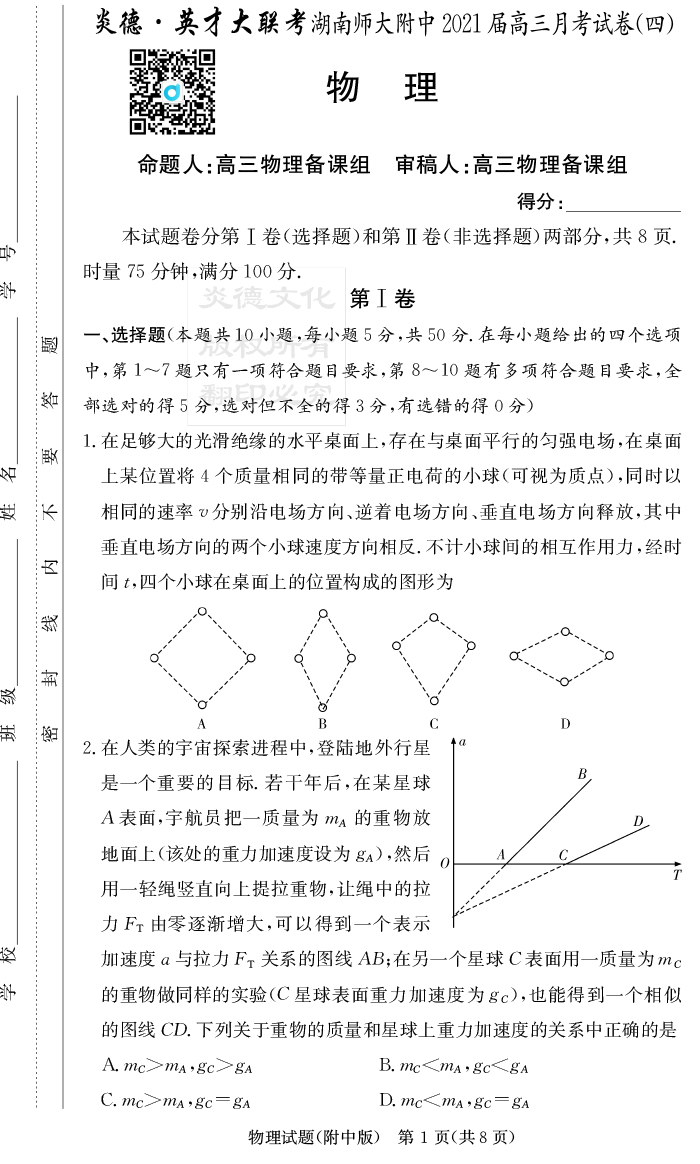 【物理】炎德英才大聯(lián)考2021屆湖南師大附中高三4次月考