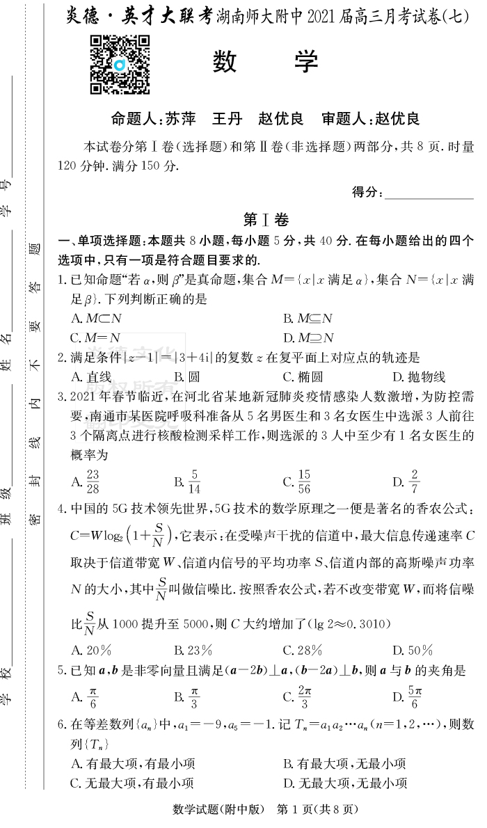 2026湖南師大附中新高考考前小題訓練·數(shù)學