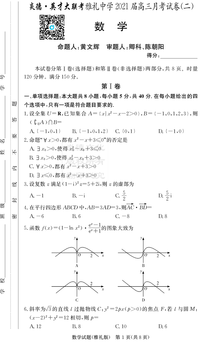 【數(shù)學(xué)】炎德英才大聯(lián)考2021屆雅禮中學(xué)高三2次月考