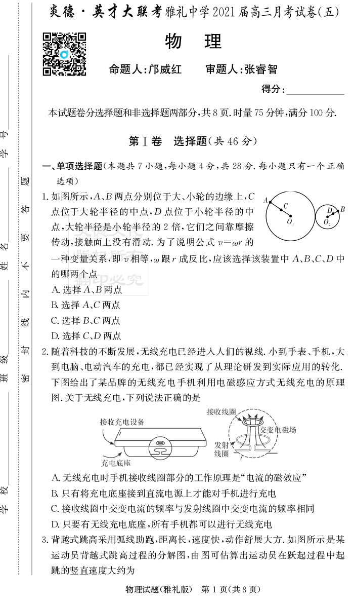 【物理】炎德英才大聯(lián)考2021屆雅禮中學(xué)高三5次月考