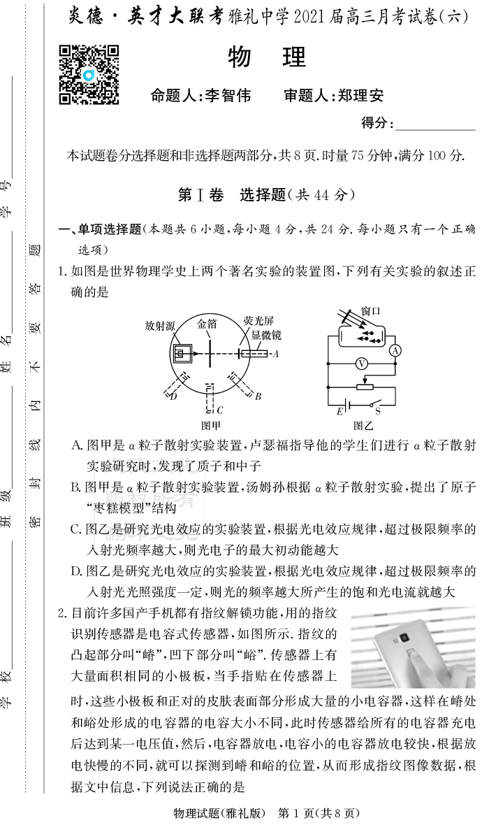 【物理】炎德英才大聯(lián)考2021屆雅禮中學(xué)高三6次月考