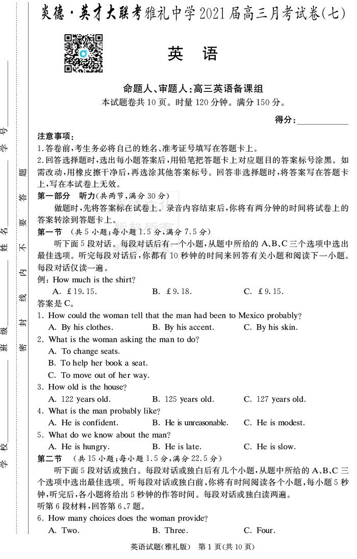 【英語】炎德英才大聯(lián)考2021屆雅禮中學(xué)高三7次月考