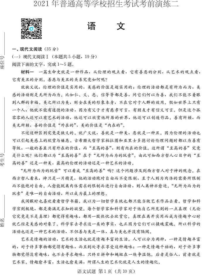 【語(yǔ)文】2021年普通高等學(xué)校招生全國(guó)統(tǒng)一考試考前演練(二)