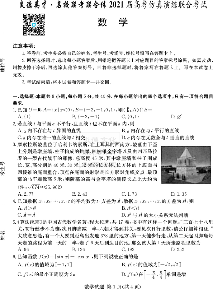 【數(shù)學(xué)】2021年普通高等學(xué)校招生全國統(tǒng)一考試考前演練(五)
