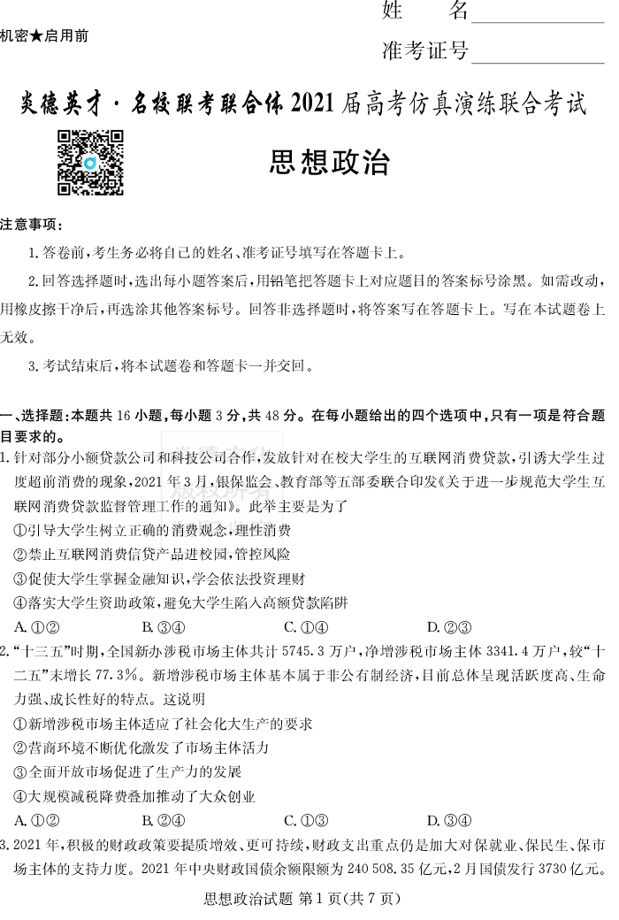 【政治】2021年普通高等學(xué)校招生全國統(tǒng)一考試考前演練(五)
