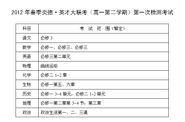 2012年春季高一第一次月考考試范圍