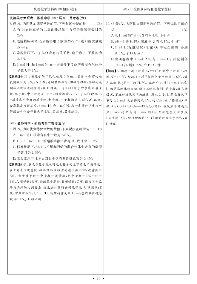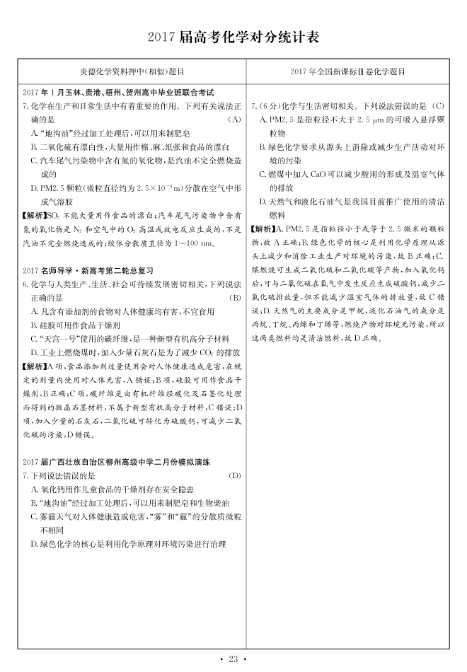 2017高考全國(guó)卷Ⅲ對(duì)分表-化學(xué)