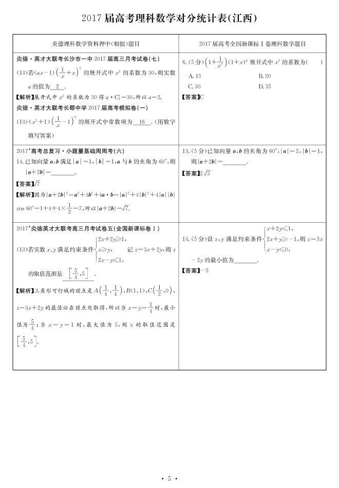 2017高考全國新課標(biāo)卷Ⅰ對(duì)分表-理數(shù)