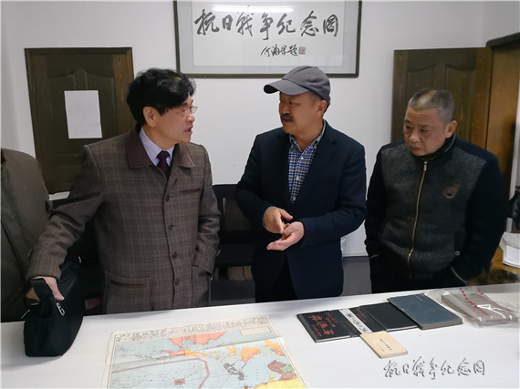 長沙市抗戰(zhàn)文化研究會會長、抗日戰(zhàn)爭紀念網(wǎng)主編、抗日戰(zhàn)爭圖書館館長何譽軍(左二)向長沙市關工委主任董學生(左一)等介紹抗日戰(zhàn)爭圖書館館藏資料
