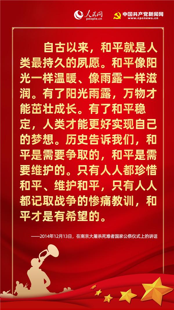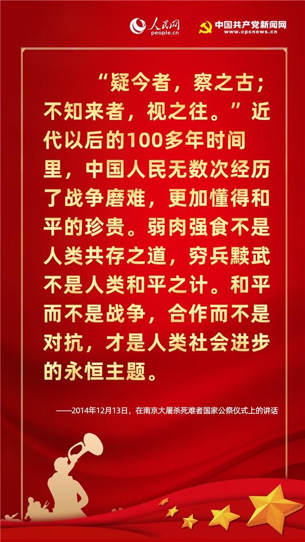 歷史不僅關乎過去,更關乎現(xiàn)在和未來。紀念歷史不是為了咀嚼苦難、延續(xù)仇恨,而是為了重申和平與正義的價值,從歷史中汲取智慧,獲得開創(chuàng)未來的精神力量。在七七事變83周年的今天,人民網(wǎng)·中國共產(chǎn)黨新聞網(wǎng)梳理十八大以來習近平總書記有關“戰(zhàn)爭與和平”的重要論述,讓我們一起“銘記歷史、緬懷先烈、珍視和平、警示未來”。