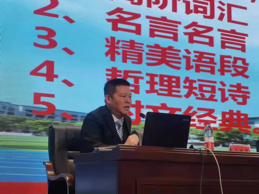 講座伊始,主持人劉滿和副校長向全體師生介紹了本次講座的主講人馬繼德老師:馬繼德老師是長郡中學(xué)特聘高中語文研究員,長郡中學(xué)清北班培訓(xùn)專家,組大組長,省、市高級教師評審專家?guī)煸u委。1994年、1997年先后被市級、省級職稱評審委員會破格晉升為中學(xué)一級、中學(xué)高級語文教師,是長沙市2010年首批晉升的中學(xué)五級教師。曾獲創(chuàng)新杯及葉圣陶杯全國一等獎優(yōu)秀指導(dǎo)教師、市級教學(xué)比武一等獎、市級十佳教師、縣級勞動模范等榮譽(yù),是全國及省中語會授予的作文教學(xué)優(yōu)秀教師。在省級、國家級報(bào)刊上公開發(fā)表論文數(shù)十篇,有省級一等獎結(jié)題課題,撰寫高考輔導(dǎo)書籍二百萬余字。近幾年在安徽、江西、湖南、廣東、廣西、湖北等省市縣完成高考備考講座百余場,應(yīng)邀在懷化、婁底、郴州、岳陽、常德、邵陽、永州、湘西、長沙、玉林、柳州、池州、荊州、赤壁、武漢、湖南師范大學(xué)等地完成市級、省級教師培訓(xùn)或高三復(fù)習(xí)研討會講座30余場。每一種卓越身份,每一項(xiàng)高光榮譽(yù),每一個沉甸甸的成就,都昭示著這場講座的含金量。在熱烈的掌聲中,身著正裝、神采飛揚(yáng)、風(fēng)度翩翩的馬老師開始為時兩個小時的講座。