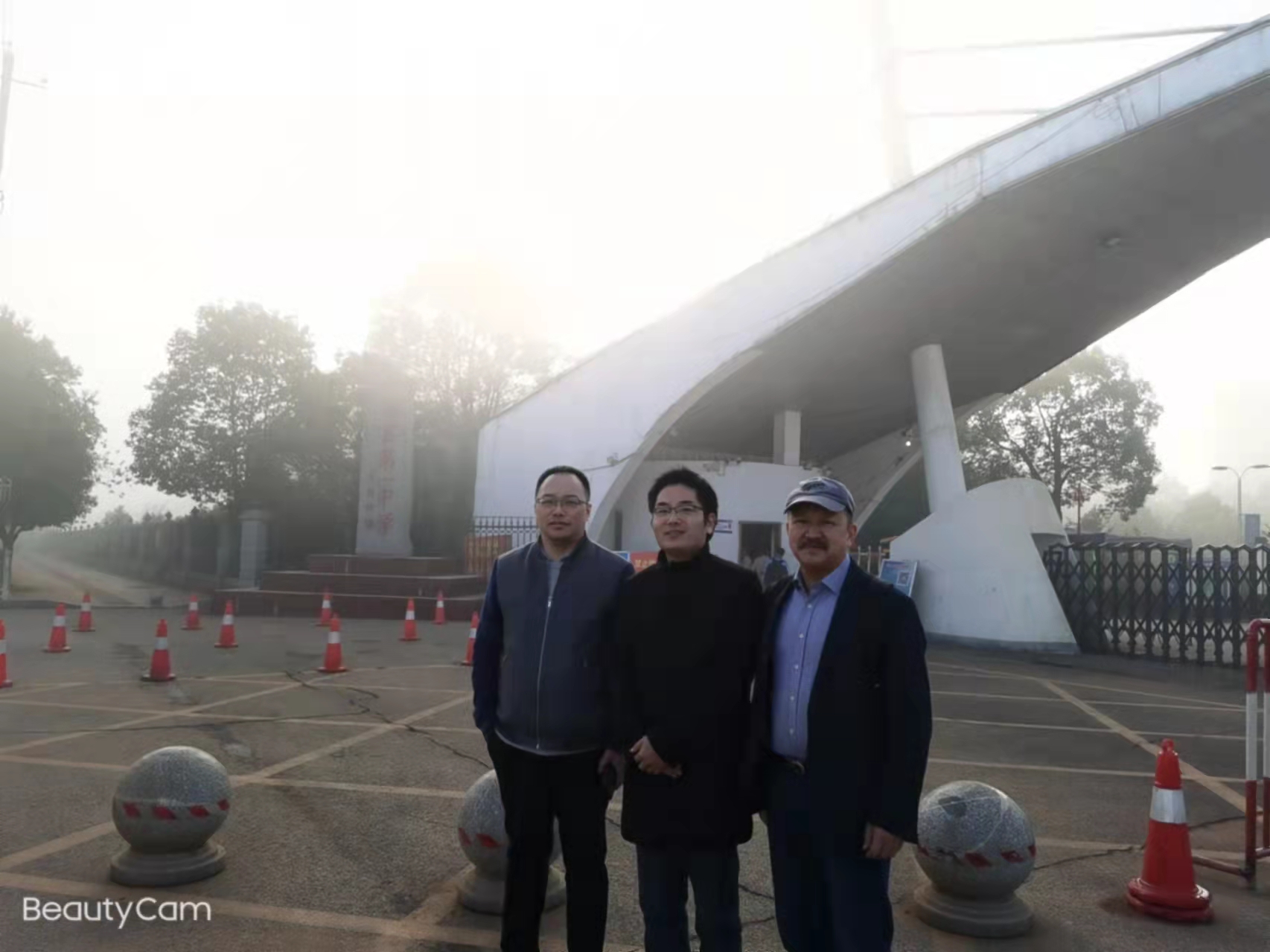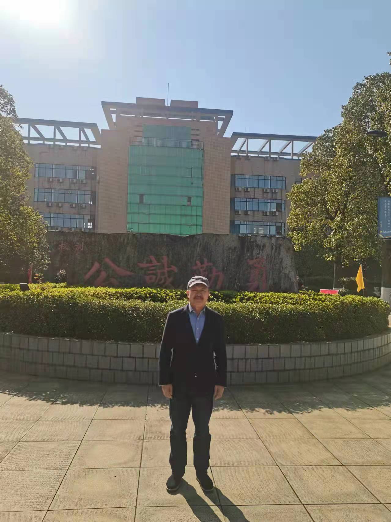 何總與教育專家在湘陰縣湘陰第一中學校門口合影