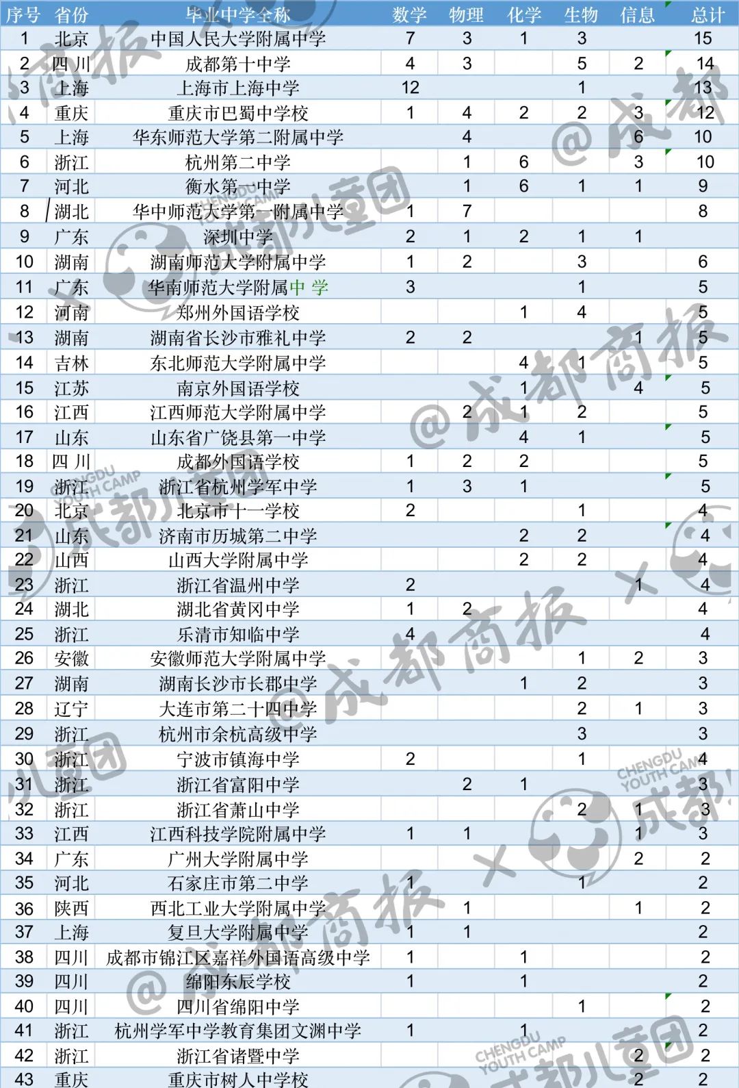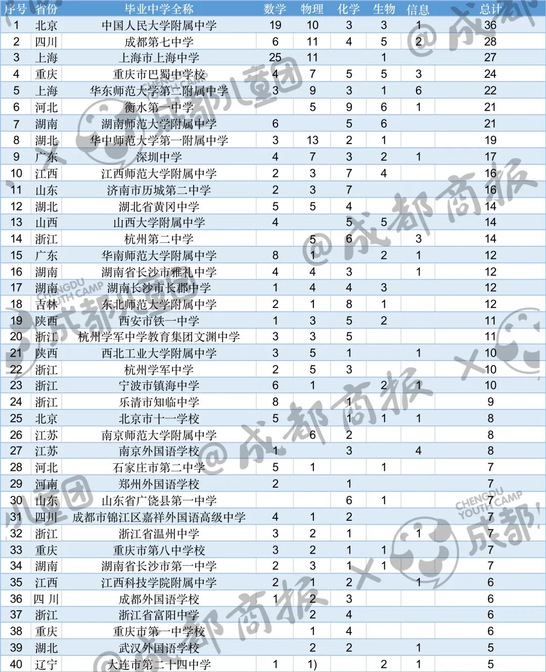 其中國(guó)集中學(xué)榜前三的競(jìng)爭(zhēng)是比較強(qiáng)的,中國(guó)人民大學(xué)附屬中學(xué)以各學(xué)科總計(jì)15人位列第一,成都第七中學(xué)則僅以1人之差,以各學(xué)科總計(jì)14人位列第二,上海中學(xué)以各學(xué)科總計(jì)13人位列第三。