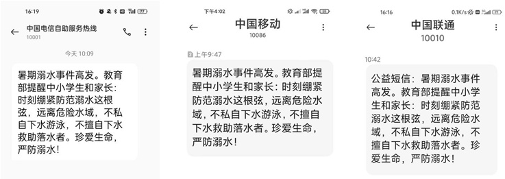 7月13日,教育部、工信部協(xié)調(diào)中國電信、中國移動、中國聯(lián)通三大運營商,向全國手機用戶發(fā)送了暑期防溺水公益短信。短信內(nèi)容為:暑期溺水事件高發(fā),教育部提醒中小學(xué)生和家長,時刻緊繃防范溺水這根弦,遠離危險水域,不私自下水游泳,不擅自下水救助落水者。珍愛生命,嚴防溺水!不少學(xué)生家長收到公益短信后表示,孩子安全大意不得,將會履行好監(jiān)護職責(zé),高度關(guān)注孩子暑期安全。