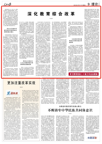 教育是國之大計、黨之大計,教育興則國家興,教育強(qiáng)則國家強(qiáng)。黨的二十屆三中全會通過的《中共中央關(guān)于進(jìn)一步全面深化改革、推進(jìn)中國式現(xiàn)代化的決定》(以下簡稱《決定》)提出:“教育、科技、人才是中國式現(xiàn)代化的基礎(chǔ)性、戰(zhàn)略性支撐”,并從深入實(shí)施科教興國戰(zhàn)略、人才強(qiáng)國戰(zhàn)略、創(chuàng)新驅(qū)動發(fā)展戰(zhàn)略,統(tǒng)籌推進(jìn)教育科技人才體制機(jī)制一體改革,健全新型舉國體制,提升國家創(chuàng)新體系整體效能出發(fā),對深化教育綜合改革作出系統(tǒng)部署。我們要深入學(xué)習(xí)貫徹全會精神,通過深化教育綜合改革,不斷為加快建設(shè)教育強(qiáng)國提供動力,有效支撐引領(lǐng)中國式現(xiàn)代化。