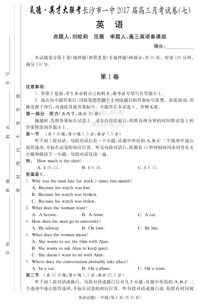 【英語(yǔ)】炎德英才大聯(lián)考2017長(zhǎng)沙一中高三7次月考